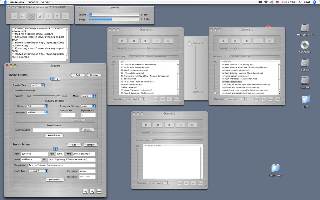 The MuSE developers describe it as an application for the mixing, encoding, and network streaming of sound: it can mix up to 6 encoded audio bitstreams (from files or network, mp3 or ogg) plus a souncard input signal, the resulting stream can be played locally on the sound card and/or encoded at different bitrates, recorded to harddisk and/or streamed to the net. When sent to a server, the resulting audio can be listened through the net by a vast number of players available on different operating systems.